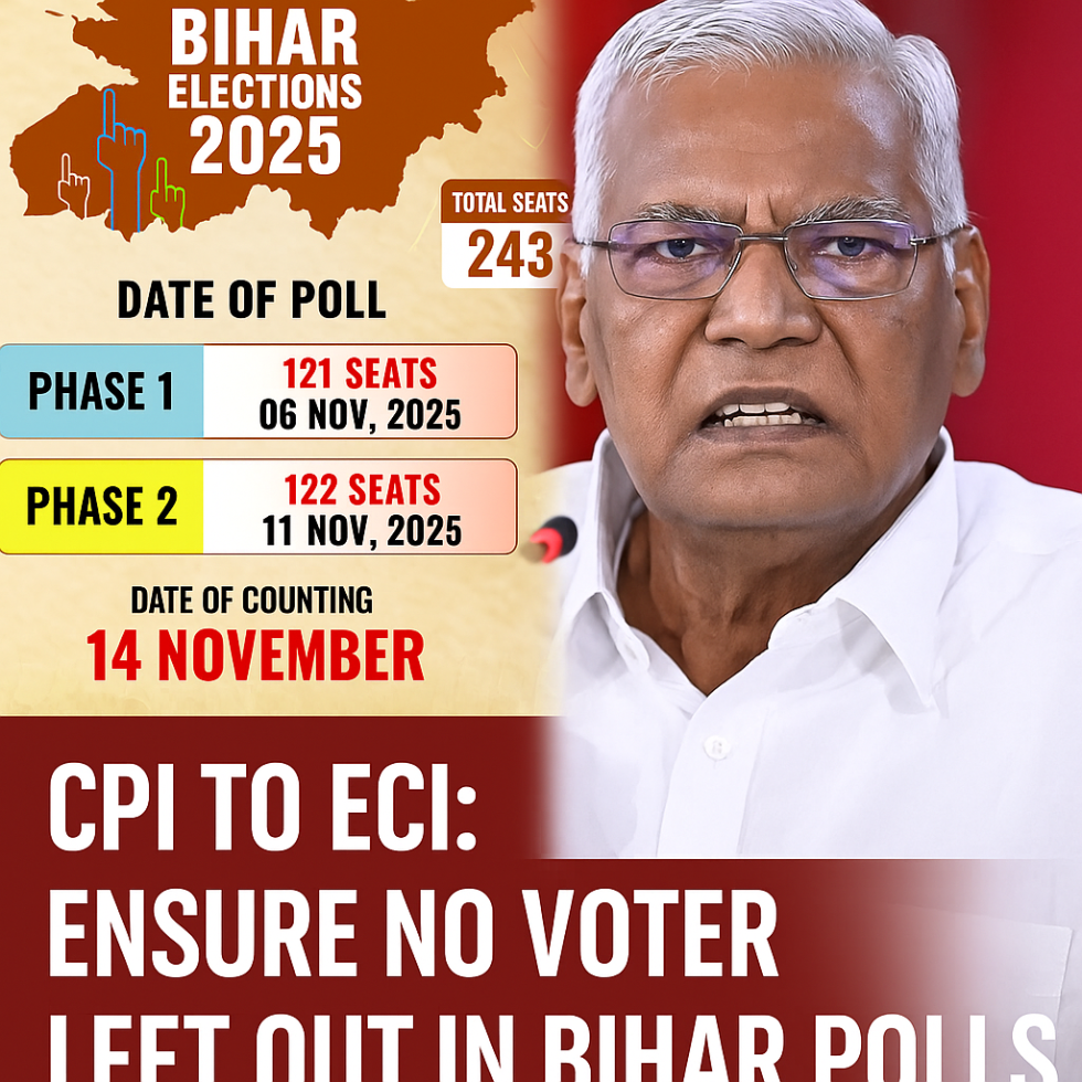 Patna — As the Election Commission of India (ECI) finalises preparations for the Bihar Assembly elections scheduled in two phases on November 6 and November 11, political parties and civil society groups have intensified their scrutiny of the electoral rolls. The Communist Party of India (CPI) on Tuesday urged the ECI to ensure that “no eligible voter is left out,” stressing that the commission has a constitutional duty to safeguard enrolment and participation ahead of what is being billed as a crucial contest in the country’s political calendar.